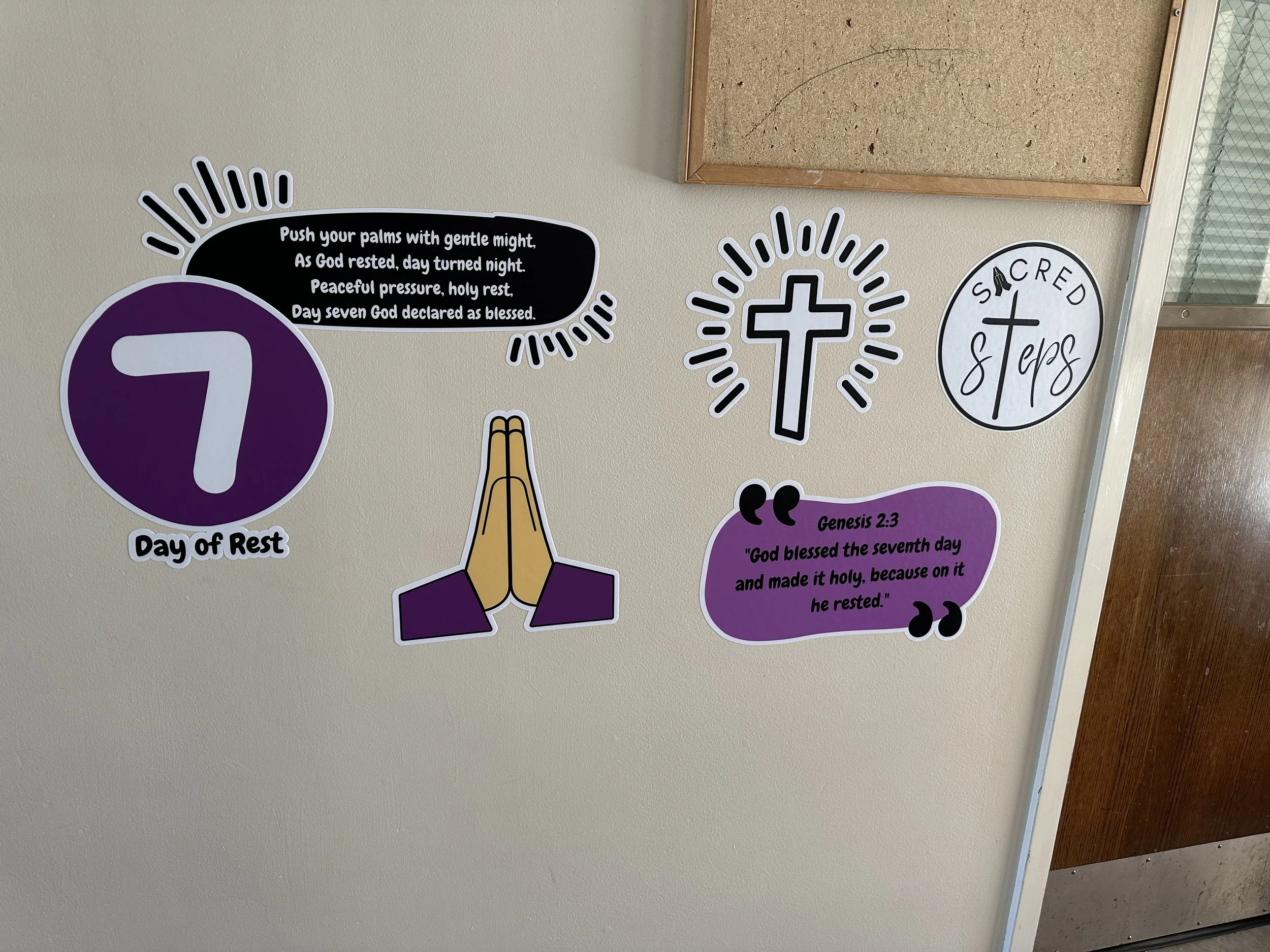 Perfect for hallways, classrooms, or sensory spaces, this wall-mounted path encourages faith-filled movement that supports both the body and spirit. This path can be installed horizontally (as shown) or vertically to gives it a different but equally meaningful and engaging look for students to interact with.