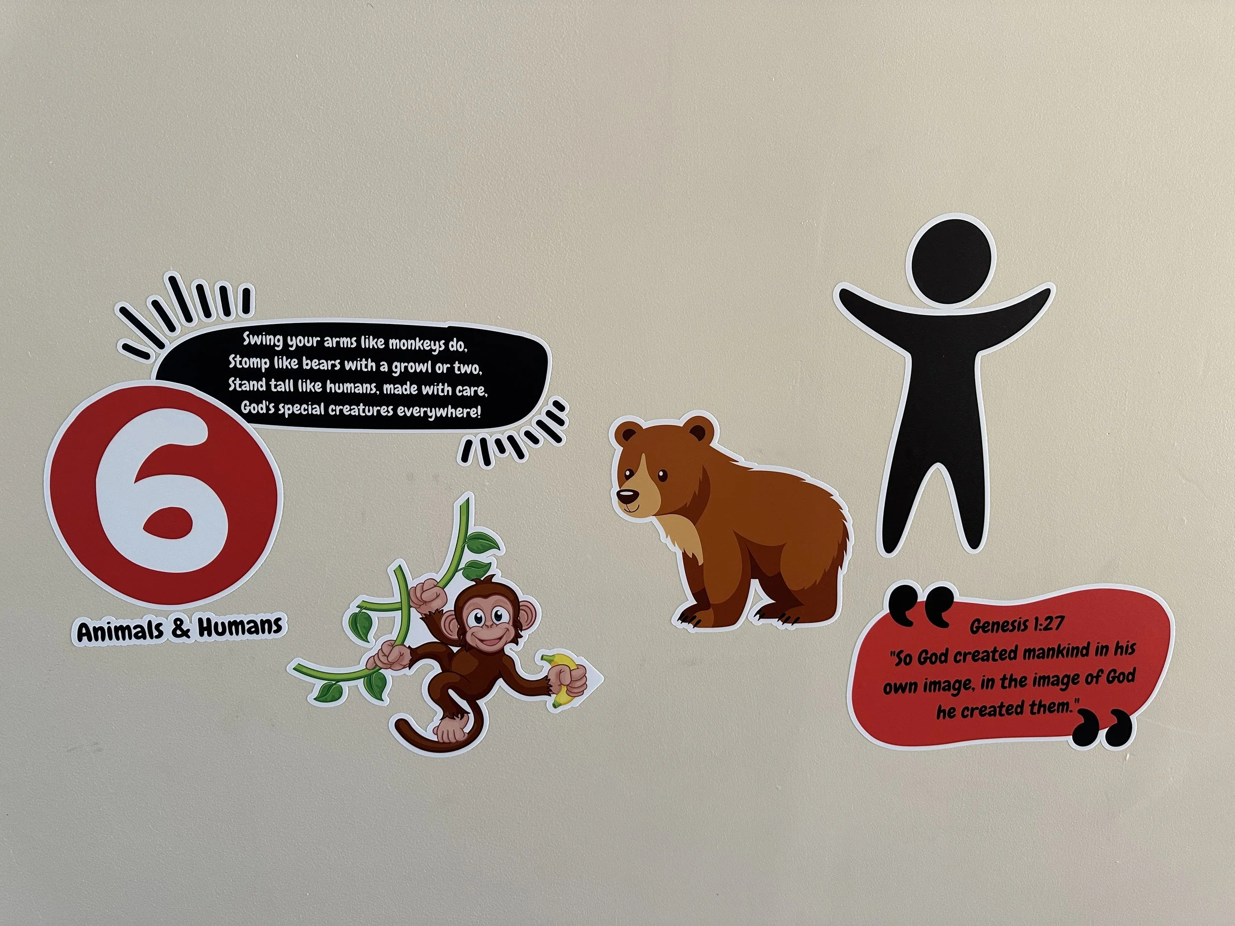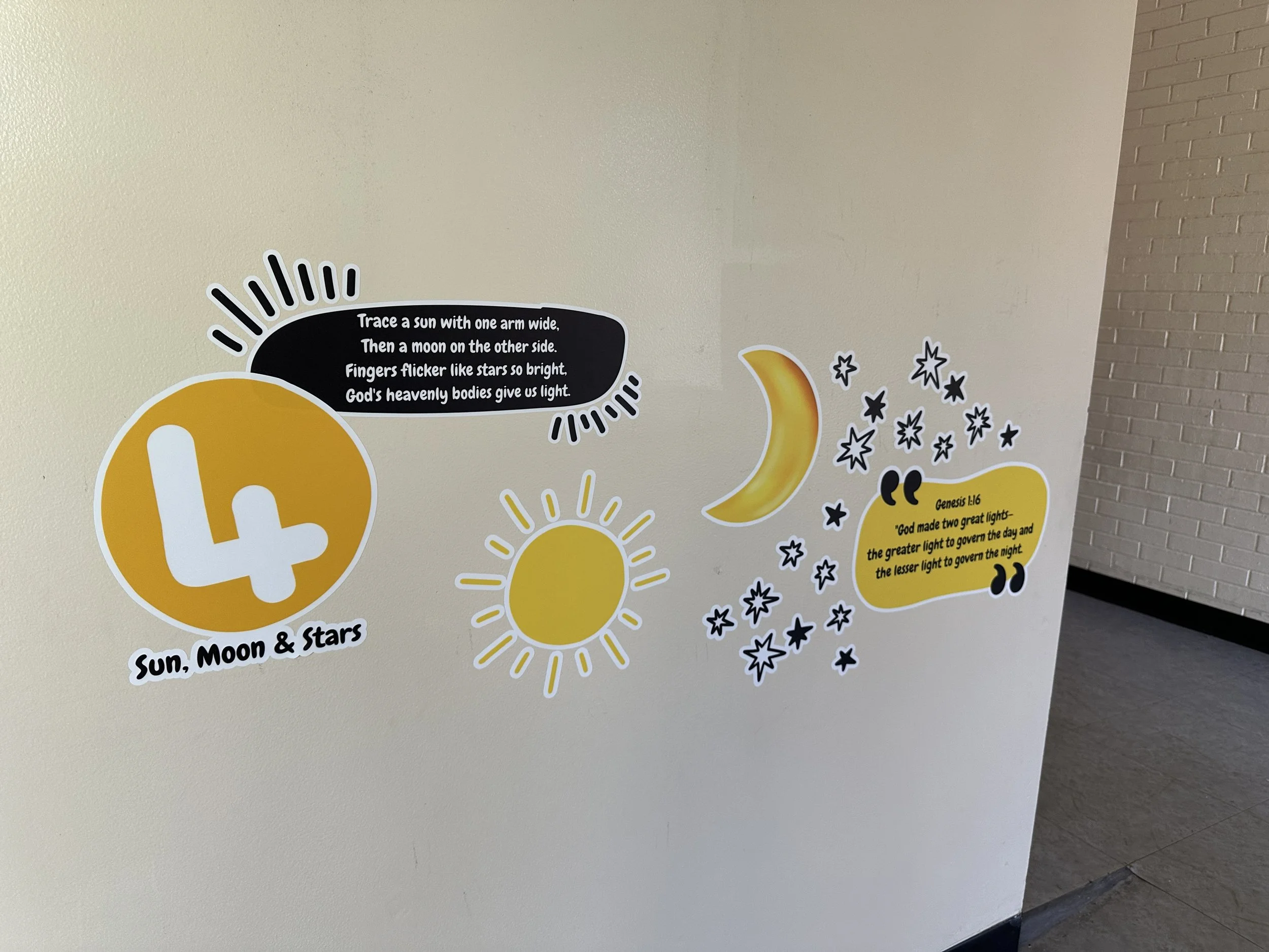 Each station along the path represents one of the seven days of creation, featuring vibrant visuals, corresponding scripture, and an interactive movement activity. From "Let there be light" to "God rested," students will trace, reach, stretch, and balance as they immerse themselves in the story.