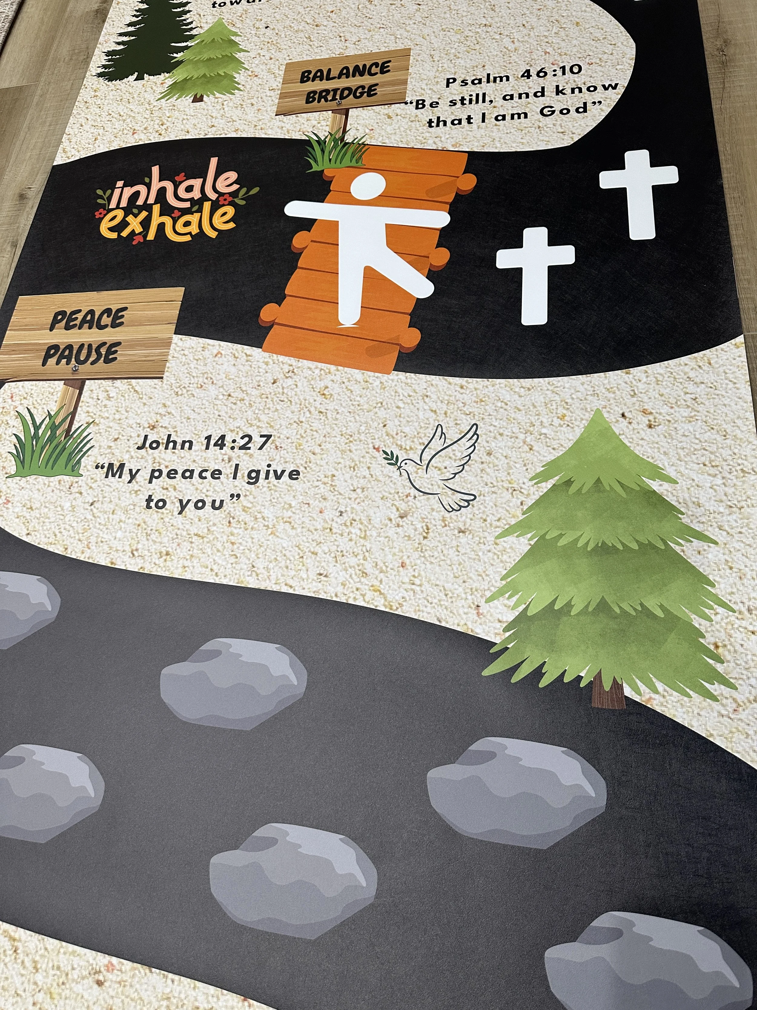This interactive sensory path features six engaging activities, each representing a step on the mountain journey. Students will jump, balance, stretch, and move their way through each station, building strength, coordination, and focus as they progress upward. Along the way, they’ll encounter motivational phrases and faith-based reflections to encourage resilience and determination – just like climbing a real mountain!