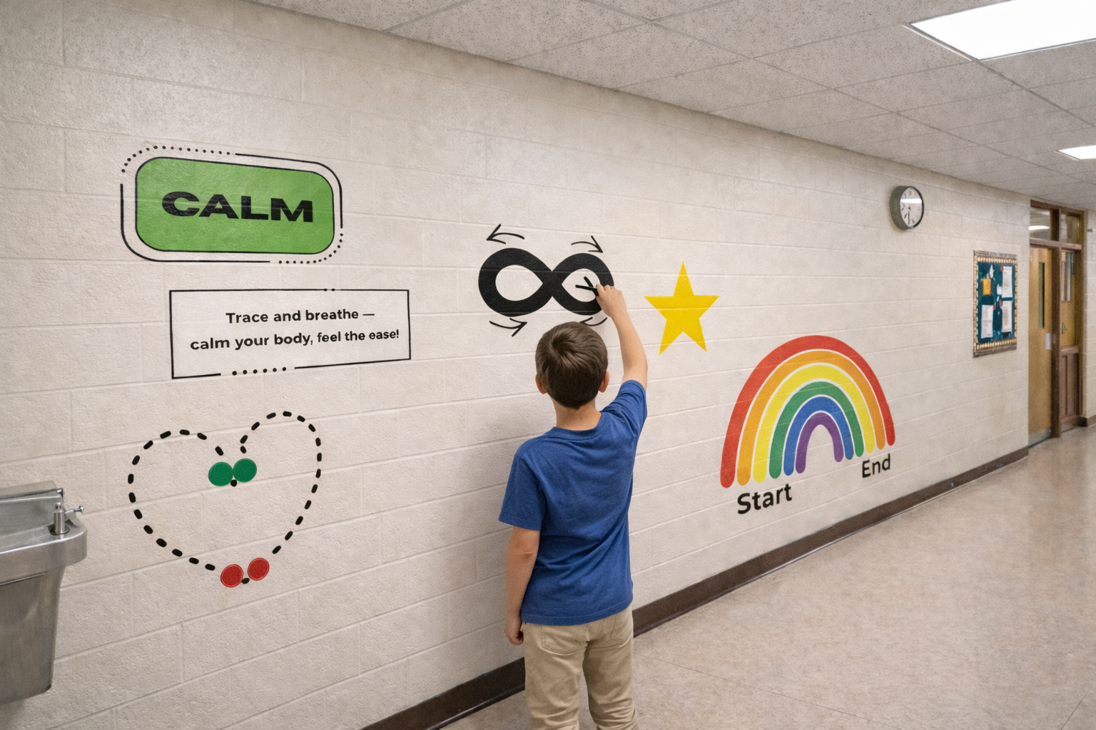 This CALM station is designed to support self-regulation and emotional reset through slow, intentional movement and breathing. Students trace the visuals while regulating their breath, helping their bodies settle and their minds refocus.