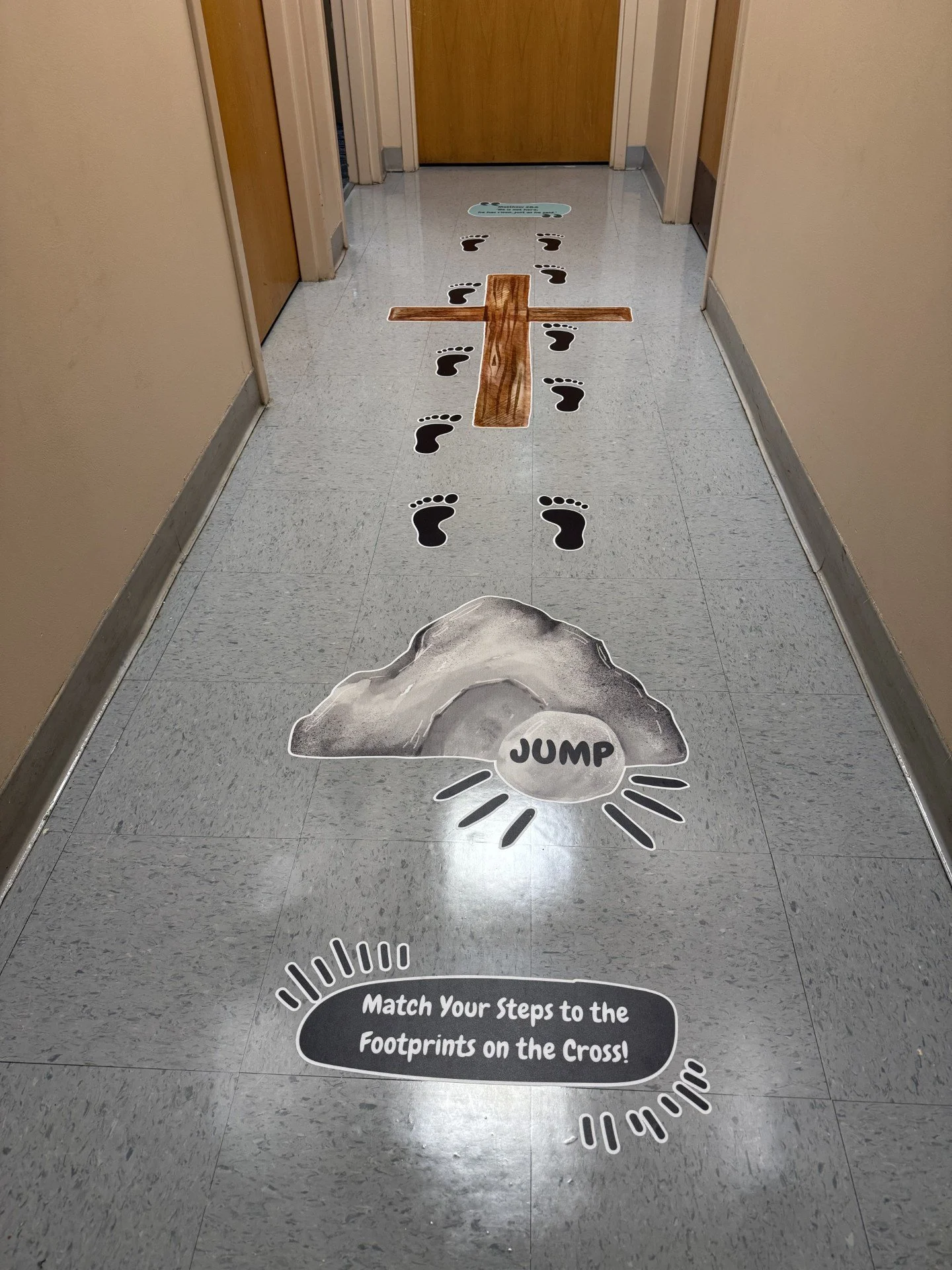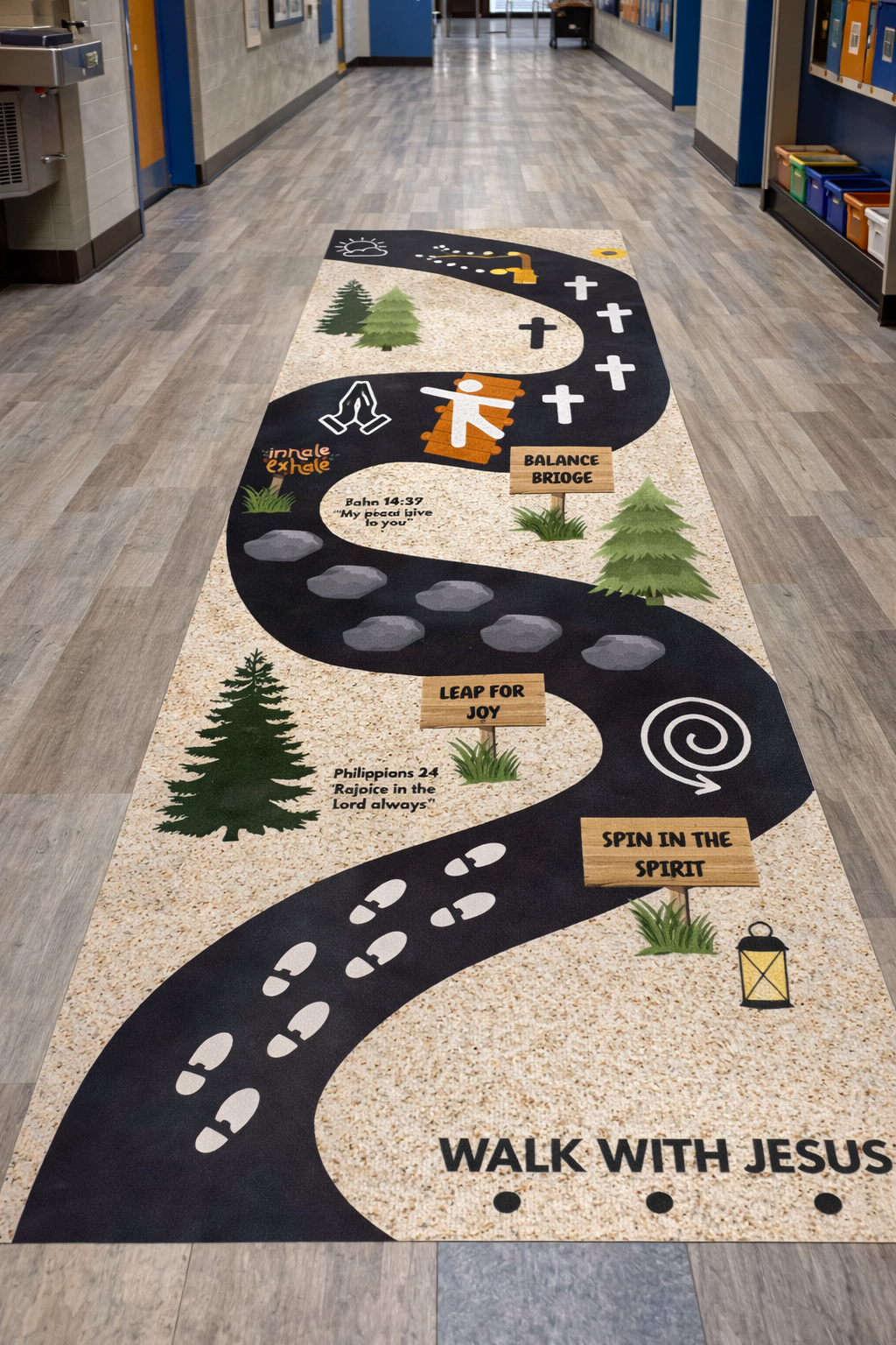Created for Catholic schools, parishes, and religious education programs, this path combines gross-motor movement, sensory regulation, and faith formation in a way that is both engaging and developmentally beneficial. As students follow each step along the path, they encounter visual symbols and simple movement prompts aligned to each Sacrament—supporting both body and soul.
