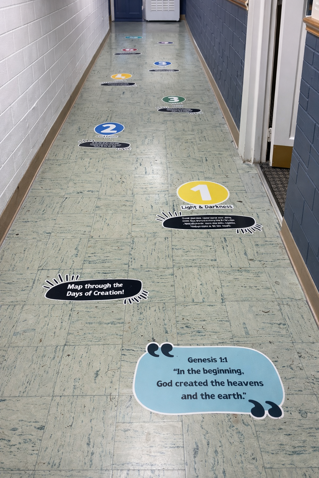 Each station along the path represents one of the seven days of creation, featuring vibrant visuals, corresponding scripture, and an interactive movement activity. From "Let there be light" to "God rested," students will trace, reach, stretch, and balance as they immerse themselves in the story.